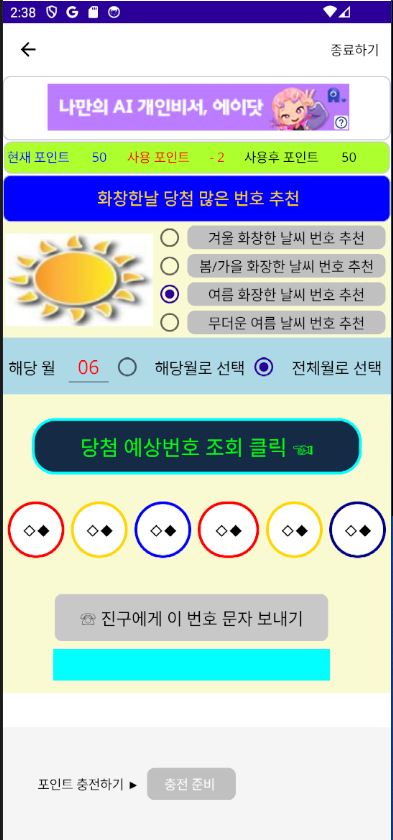 자동로또드뎌 로또 번호 자동 추출 앱출시 했습니다...^^ 날씨별로 추천해주는 앱입니다... 안드로이드폰 Play 스토어에서 " 재물게임 " 이라고 검색 하고 New 탭이나 신규 탭에서 찾아보세요...